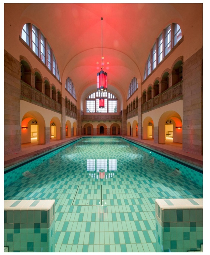 Hotel Oderberger, originally a public pool built in 1898, has been transformed into a modern design hotel while preserving its historic decor. Its pool is equipped with a liftable floor that allows the space to be converted into a multipurpose hall, and the former changing rooms and showers have been repurposed as guest rooms and seminar rooms. The lounges and meeting spaces retain original architectural details, earning the hotel a cultural heritage preservation award.