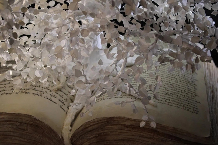 「物語の始まり」を主題に、本から物語が溢れ出すイメージを白い木の造形で表現しています。