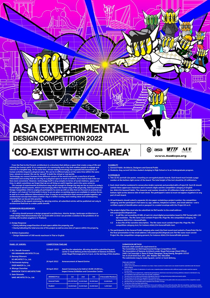 「タイ王立建築家協会(ASA) エクスペリメンタル・デザイン・コンペティション2022」は、空間の実用的な利用に焦点を当てたアイデア“CO-EXIST WITH CO-AREA”をテーマとしております。ADF(NPO青山デザインフォーラム)はASAと提携しコンペティションをサポートします。今年度の参加応募資格はタイ居住者のみとなり、応募締め切りは2022年4月19日17:00(GMT+7)までです。