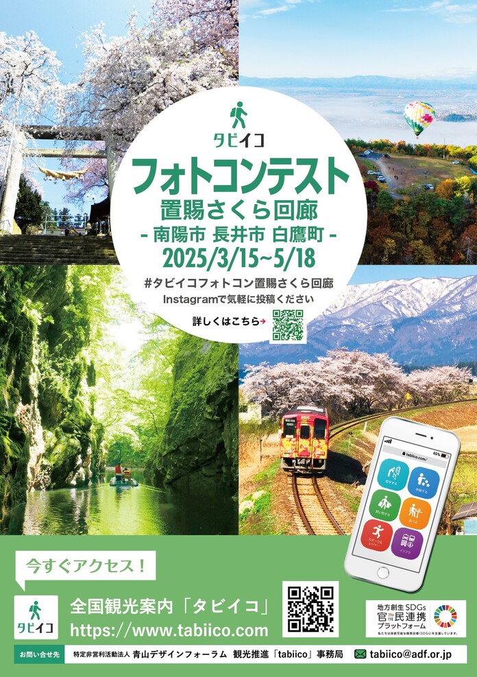 NPO青山デザインフォーラム(ADF)は、ADFが運営する観光資源検索サイト「タビイコ」と、南陽市・長井市・白鷹町の3市町村とのタイアップにより、山形県置賜地域の魅力を伝えるInstagramフォトコンテスト「タビイコフォトコン置賜さくら回廊」を開催します。
