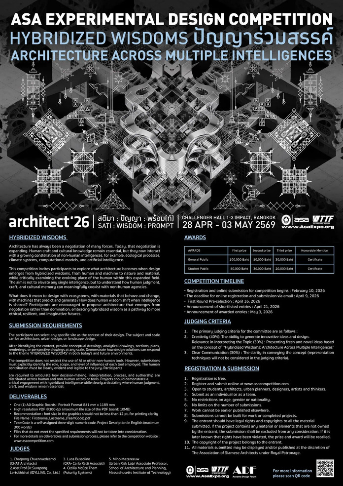 The Association of Siamese Architects (ASA) has opened entries for the "ASA Experimental Design Competition 2026." The competition will begin accepting entries on February 10, 2026, and will close on April 9, 2026. Open to participants worldwide, it welcomes proposals in architecture, urban design, and landscape design. Participants may select any site as the context for their proposal. ADF (NPO Aoyama Design Forum) collaborates with ASA to support this competition.