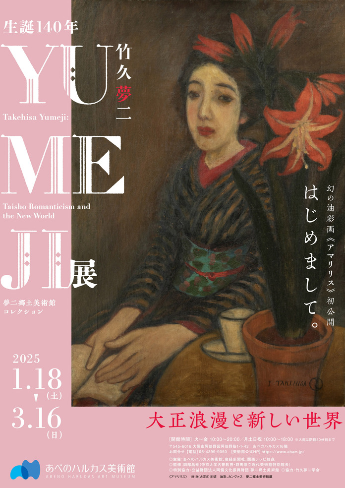 あべのハルカス美術館では2025年1月18日(土)〜 3月16日(日)の期間中、「生誕140年 YUMEJI展 大正浪漫と新しい世界」を開催します。大正ロマンの象徴であり、「夢二式美人」で一世を風靡した竹久夢二(1884-1934)は、明治から昭和前期にいたる日本近代芸術・文化の円熟した魅力をもっとも醸し出した芸術家でした。絵画だけでなく雑誌や楽譜、本の装丁、日用品のデザインなど多岐にわたるジャンルで活躍した夢二の作品は、今もなお私たちを惹きつけてやみません。本展は、夢二の生誕140年を記念し、初公開作品を含む約180点の作品や資料から夢二の画業と魅力を改めてひもときます。