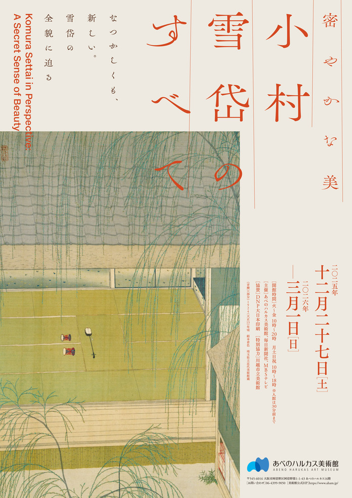 2025年12月27日(土)〜 2026年3月1日(日)の期間中、あべのハルカス美術館で「密やかな美 小村雪岱のすべて」が開催されます。大正から昭和初期にかけて、日本画や書籍の装幀、挿絵や映画の美術考証、舞台装置に至るまで、幅広く手がけた小村雪岱(1887〜1940)。本展では、泉鏡花をはじめとする数多の文学者や松岡映丘などの日本画家、出版人や舞台人たちとの交流と協働に光をあて、「人」とのつながりから雪岱の全画業を再考します。彼らの仕事へのリスペクトから、雪岱の情趣溢れる端麗な作品世界がいかに築かれたかをみつめ、新たな雪岱像の構築をめざします。