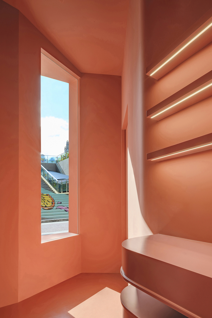 The center operating desk and reception desk, which constructed of self-created recycled terrazzo, and specially customized for the brand at the same time. This unusual substance has a distinctive surface roughness and is mainly composed of recycled plastic and stone particles.