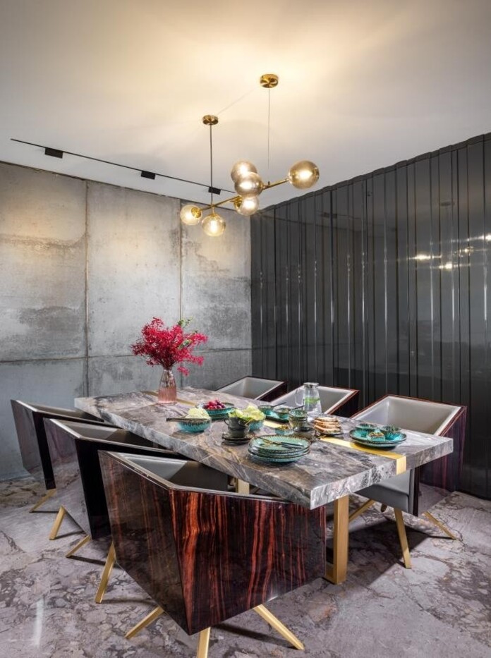 The Dark monochrome tones with a flow of texture and large fenestrations impart a humbling satisfaction as one enters the residence. It boasts its elite brass kissed furniture and interior beautifully complementing the raw materials. The Exposed concrete wall panel, outlined with brass strips and garnished with subtle artwork, makes it a perfect exquisite backdrop for the family space as well as robust and sophisticated for the drawing space.