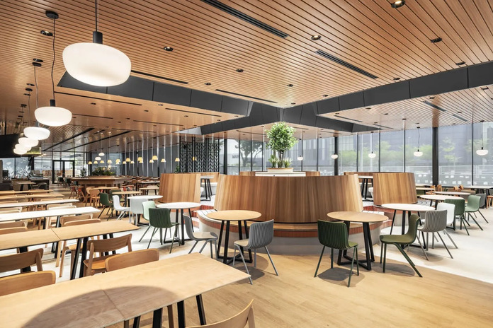 Their goal is to craft an organic environment that blurs the boundary between human-made and natural elements, instilling a sense of spaciousness and rejuvenation through clean lines and natural expressions. The space exudes a serene and therapeutic atmosphere, thanks to its neutral color palette. In the expansive cafeteria, the design team has skillfully defined various seating areas, offering diners flexibility and options to choose their preferred corners based on their mood, ensuring a personalized touch through design. In a world transitioning into an era of wellness and mindfulness post-pandemic, the significance of interaction becomes more apparent. This cafeteria aims to provide a revitalizing space where office staff can reset and unwind, appreciating life's small pleasures through spatial interactions.