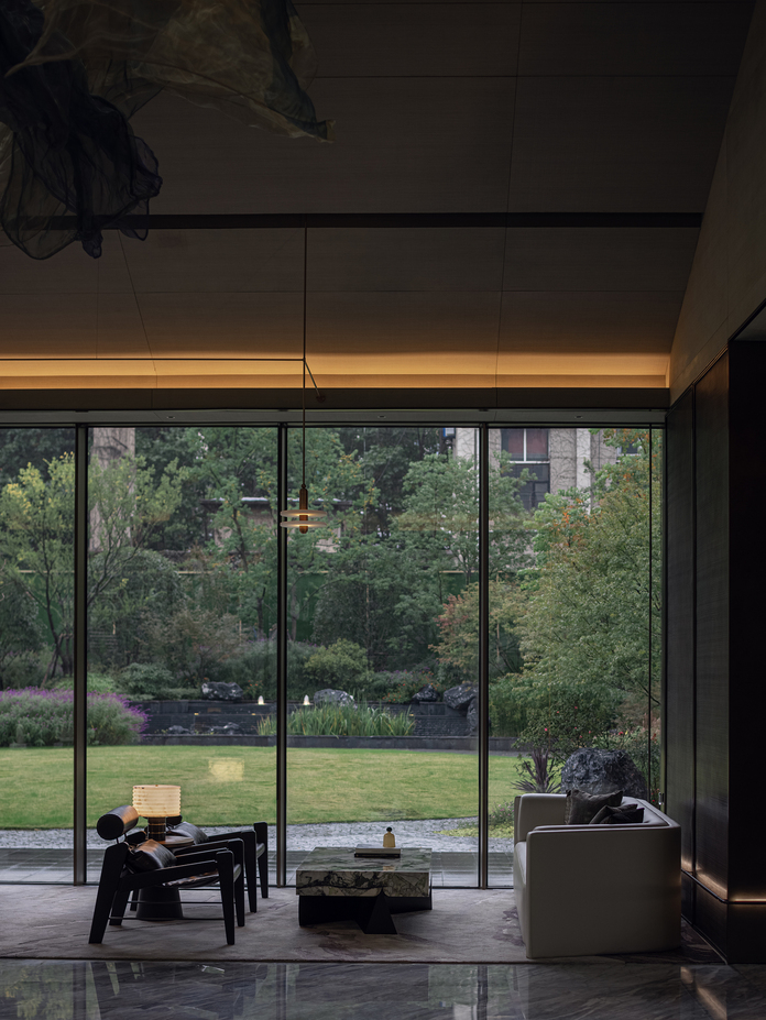 Moving inside, the atrium suddenly opens up, with simple lines and soft light interwoven, injecting vitality into the tranquil space. The wide frame brings in the outdoor greenery, quietly dissolving the boundaries between inside and outside. The conversation area and water bar are set with light, both hidden and open, harmoniously integrated.