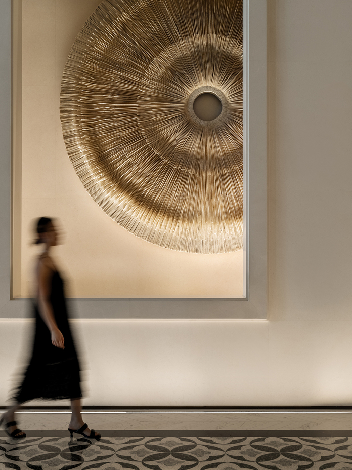 Screens frequently seen in the space are inspired by doors and windows of Lingnan architecture, fusing Oriental culture with modern art to imbue the space with Oriental elegance and lingering charm. The sequential arcades spatially associate with Lingnan architecture, recalling the fun and leisure of Lingnan culture and infusing the interior with beautiful meanings.