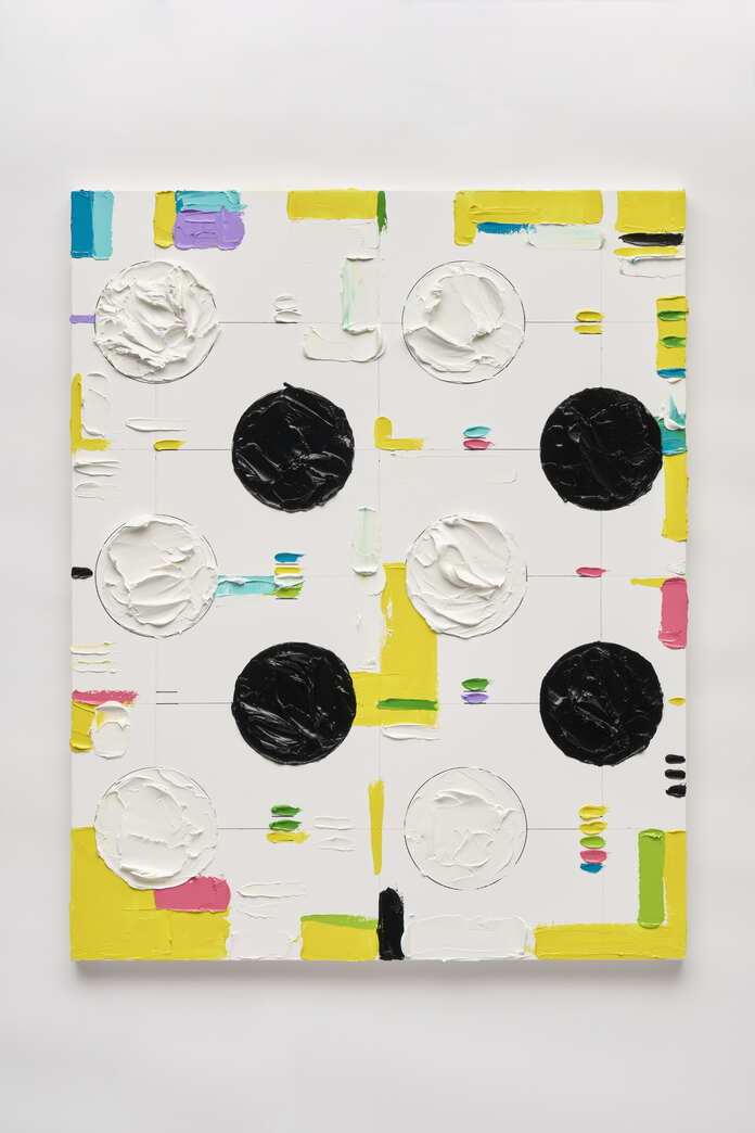He writes the algorithm, which serves as a “blueprint for the painting,” directly on the canvas, and then arranges colors and shapes based on the program he has designed.