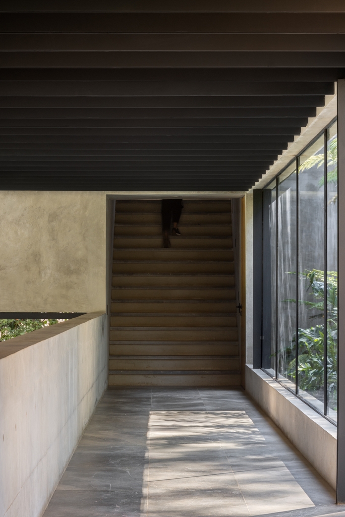 Materials are intentionally neutral and restrained, allowing the forest to remain the primary visual presence. Exposed concrete, locally sourced stucco, oak, volcanic stone, and flat clay tile roofs create a soft, monochromatic palette that highlights the surrounding greenery. The concrete base elevates the house from the ground, acting as both structure and thermal barrier against humidity.