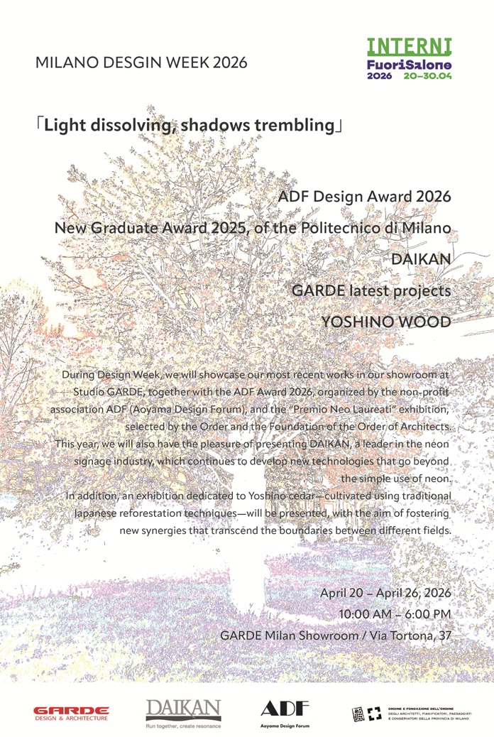 This exhibition is held in collaboration with the ¡ÈNew Graduate Award 2025 of the Politecnico di Milano¡É and also features the latest projects by GARDE. In addition, DAIKAN, a Japanese company specializing in illuminated brand signage, is participating in the exhibition, showcasing its core technologies alongside newly developed products.