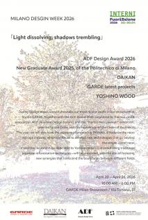 ADF × GARDE「ミラノデザインウィーク2026」期間中に共同展示2026.04.14 up NPO法人青山デザインフォーラム(ADF)は、2026年4月20日から4月26日まで開催される世界最大級のデザインイベント「ミラノデザインウィーク2026」において、「ADFデザインアワード2026」の展示をGARDEミラノショールームにて実施いたします。受賞作品は、ミラノデザインウィーク期間中に発表されます。 |